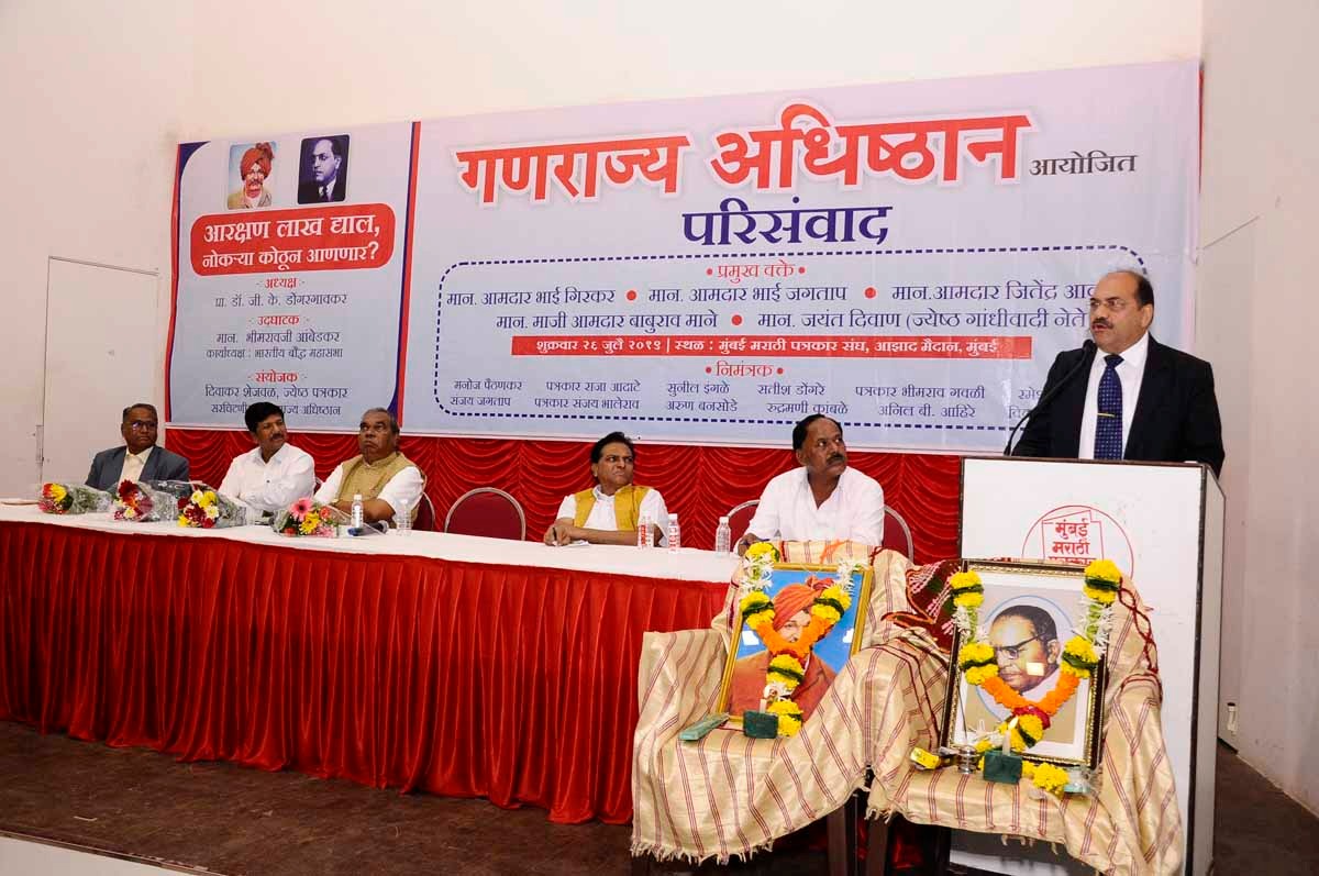 ‘आरक्षण लाख द्याल; नोकÚया कुठून आणणार?’ या विषयावरील या परिसंवादाचे सुत्र संचलन गणराज्य अधिष्ठानचे सरचिटणीस, ज्येष्ठ पत्रकार दिवाकर शेजवळ यांनी केले.