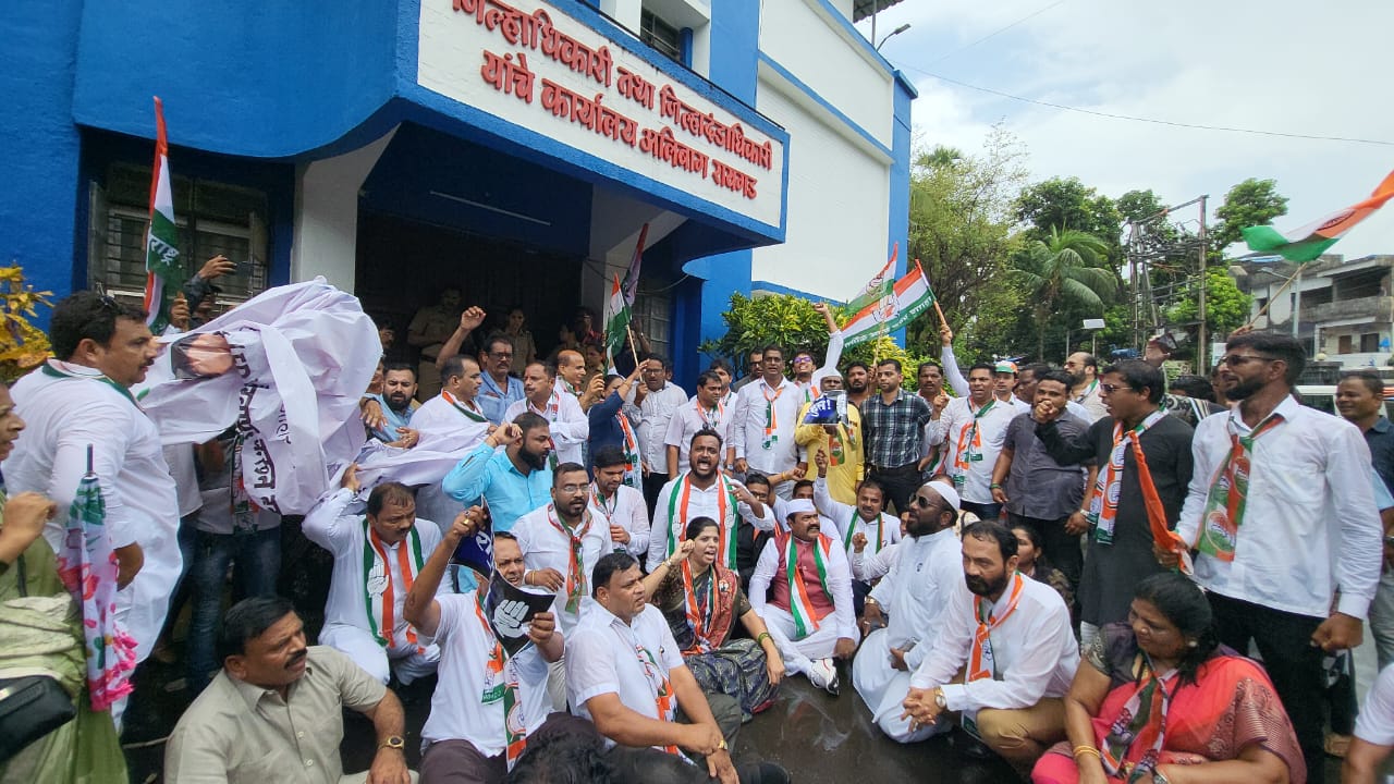 रायगड जिल्हा कॉंग्रेस अध्यक्ष महेंद्र घरत यांच्या नेतृत्वात जिल्हाधिकारी कार्यालयासमोर धरणे आंदोलन !