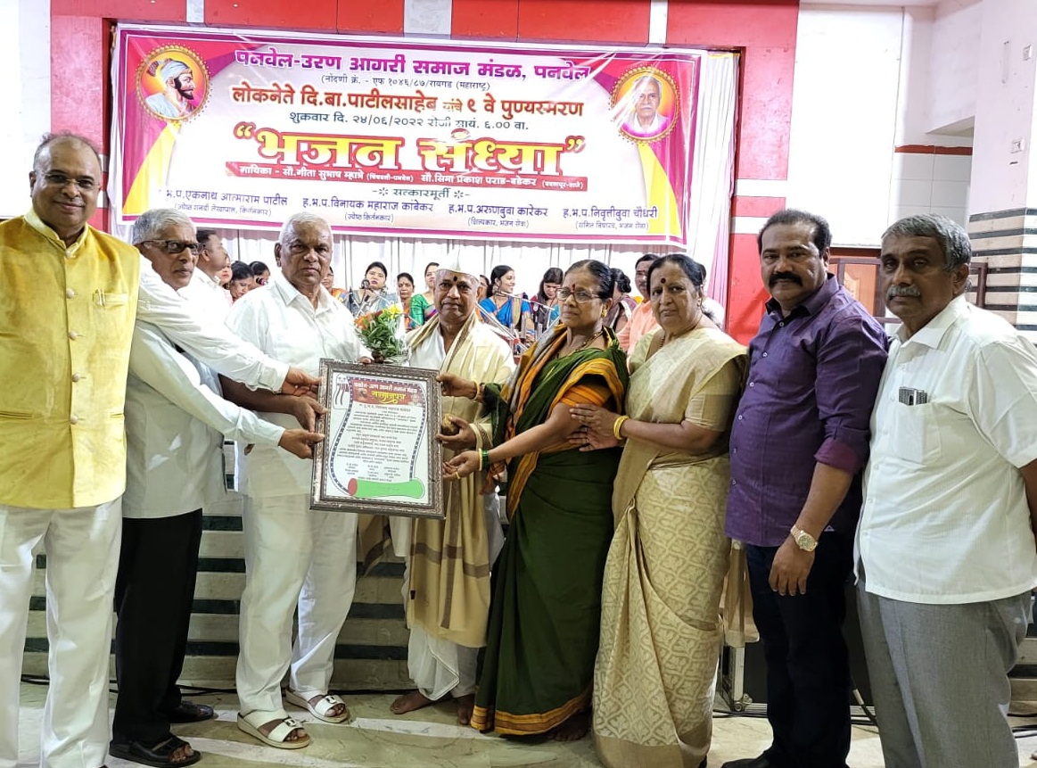 पनवेल(प्रतिनिधी) भूमिपुत्र प्रकल्पग्रस्तांचे दैवत लोकनेते दिवंगत दि. बा. पाटील यांच्या नवव्या स्मृतिदिनी आगरी समाज मंडळाच्या पनवेल येथील महात्मा फुले सभागृहात गायिका गीता सुभाष म्हात्रे व सीमा प्रकाश पराड (बडेकर) यांची भजन संध्या आयोजित करण्यात आली होती. या कार्यक्रमात वारकरी संप्रदायातील मान्यवरांचा प्रमुख पाहुणे माजी खासदार लोकनेते रामशेठ ठाकूर यांच्या हस्ते सत्कार करण्यात आला.