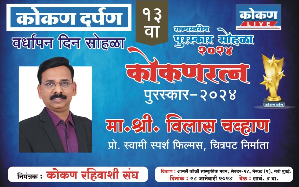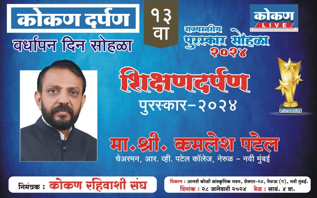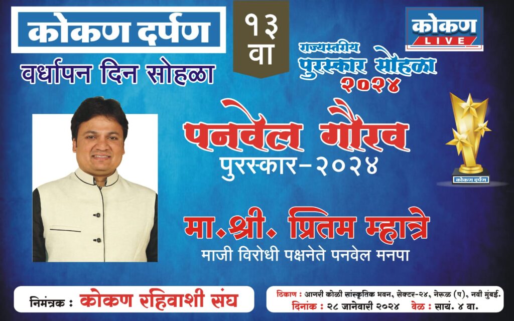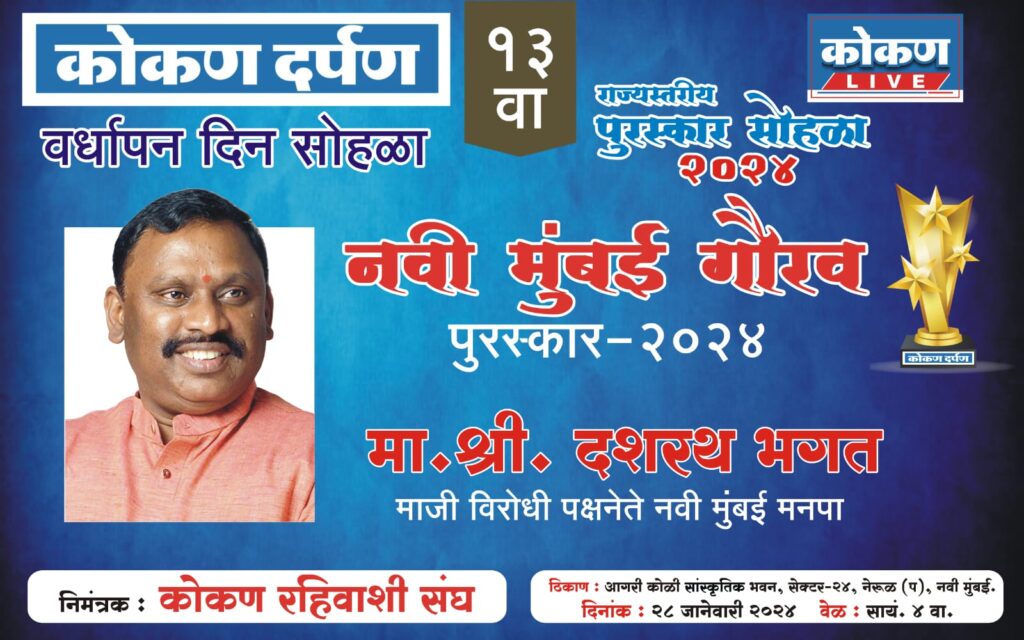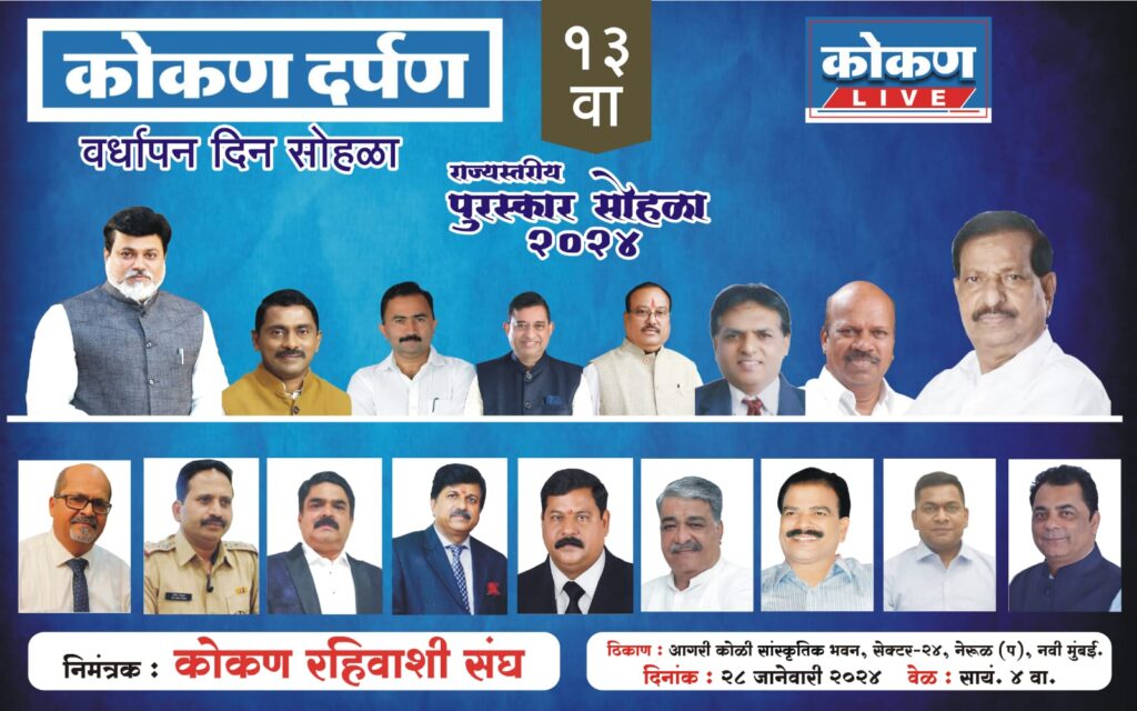 नवी मुंबई, प्रतिनिधी : कोकणाचे मुखपत्र कोकण दर्पण वृत्तपत्राचा १३ वा वर्धापन दिन आणि राज्यस्तरीय गौरव पुरस्कार सोहळ्याचे भव्य आयोजन २८ जानेवारी २०२४ रोजी करण्यात आले आहे. नेरुळ, नवी मुंबई येथील आगरी कोळी सांस्कृतीक भवन येथे सायंकाळी ४ वाजता सदर सोहळ्याचे आयोजन करण्यात आले आहे.
