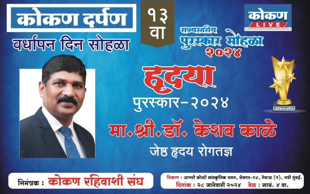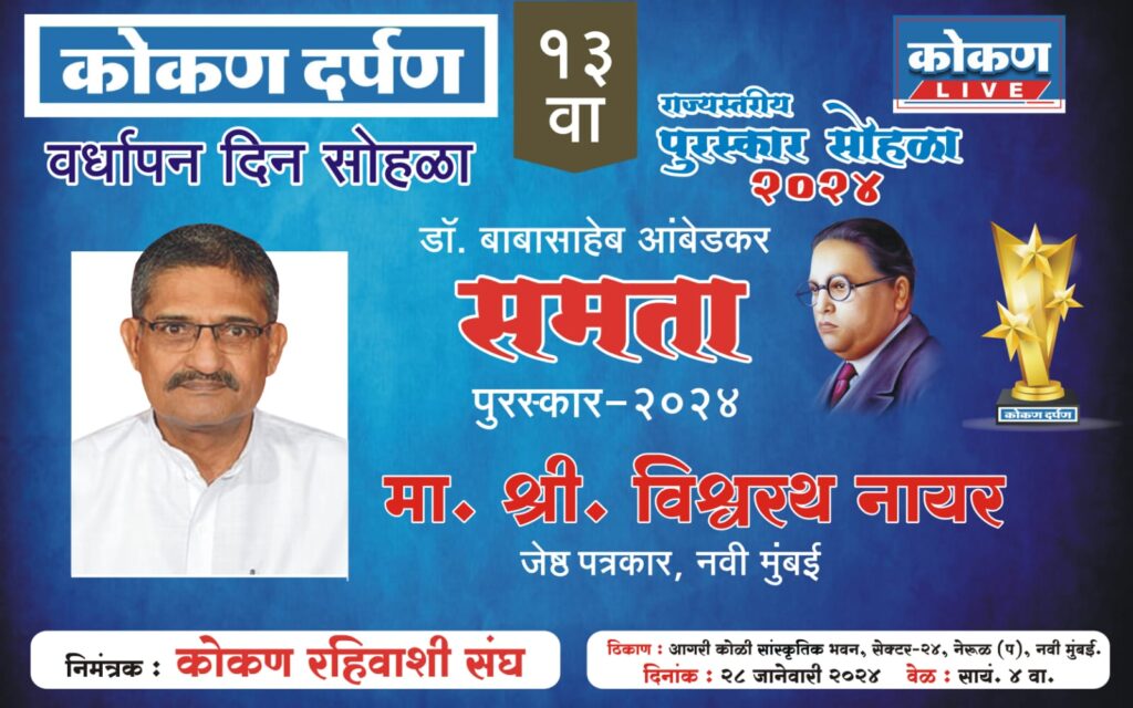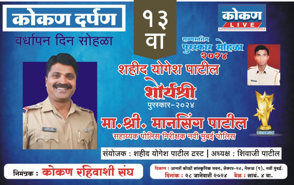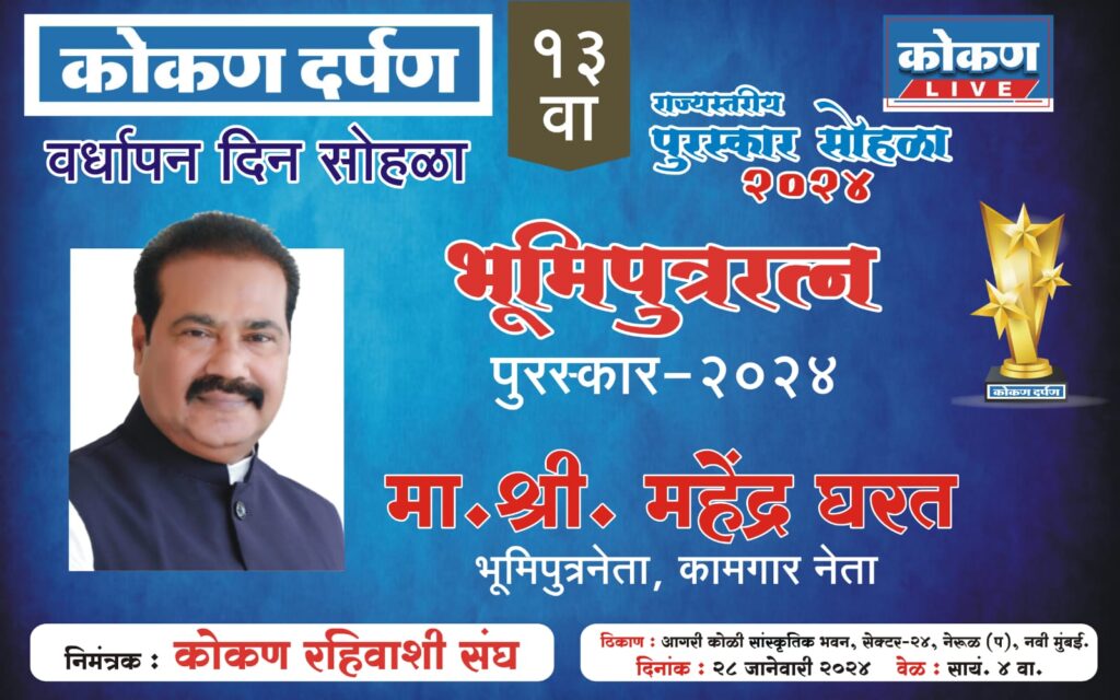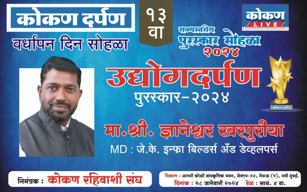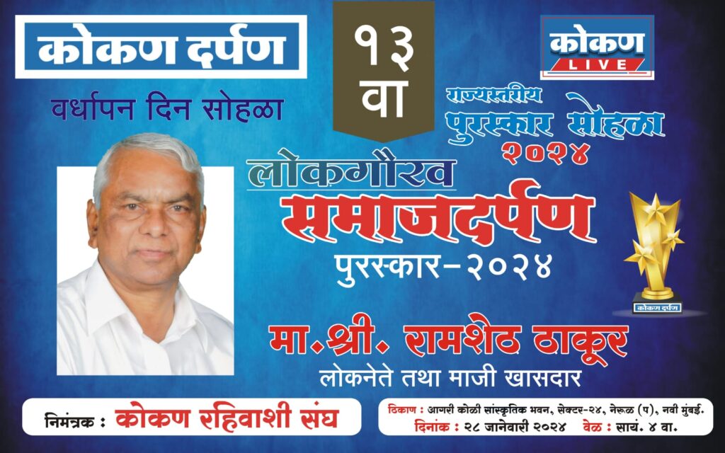 नवी मुंबई, प्रतिनिधी : कोकणाचे मुखपत्र कोकण दर्पण वृत्तपत्राचा १३ वा वर्धापन दिन आणि राज्यस्तरीय गौरव पुरस्कार सोहळ्याचे भव्य आयोजन २८ जानेवारी २०२४ रोजी करण्यात आले आहे. नेरुळ, नवी मुंबई येथील आगरी कोळी सांस्कृतीक भवन येथे सायंकाळी ४ वाजता सदर सोहळ्याचे आयोजन करण्यात आले आहे.
